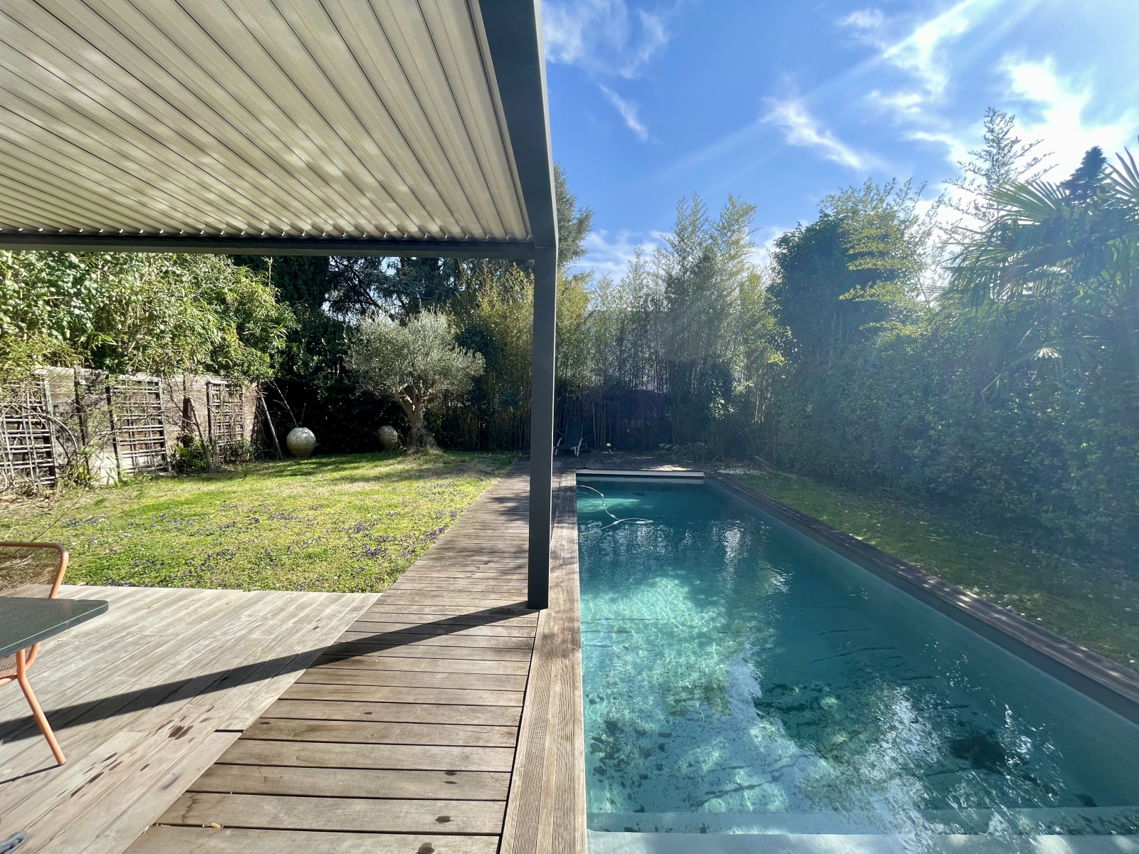 Jardinet devant la maison, à l'arrière beau jardin SUD Est végétalisé avec arrosage automatique, piscine 9x3 chauffée avec volet électrique,(réservation pour la nage à contre courant), terrasse bois de 35m2 avec partie repas sous pergola climatique.