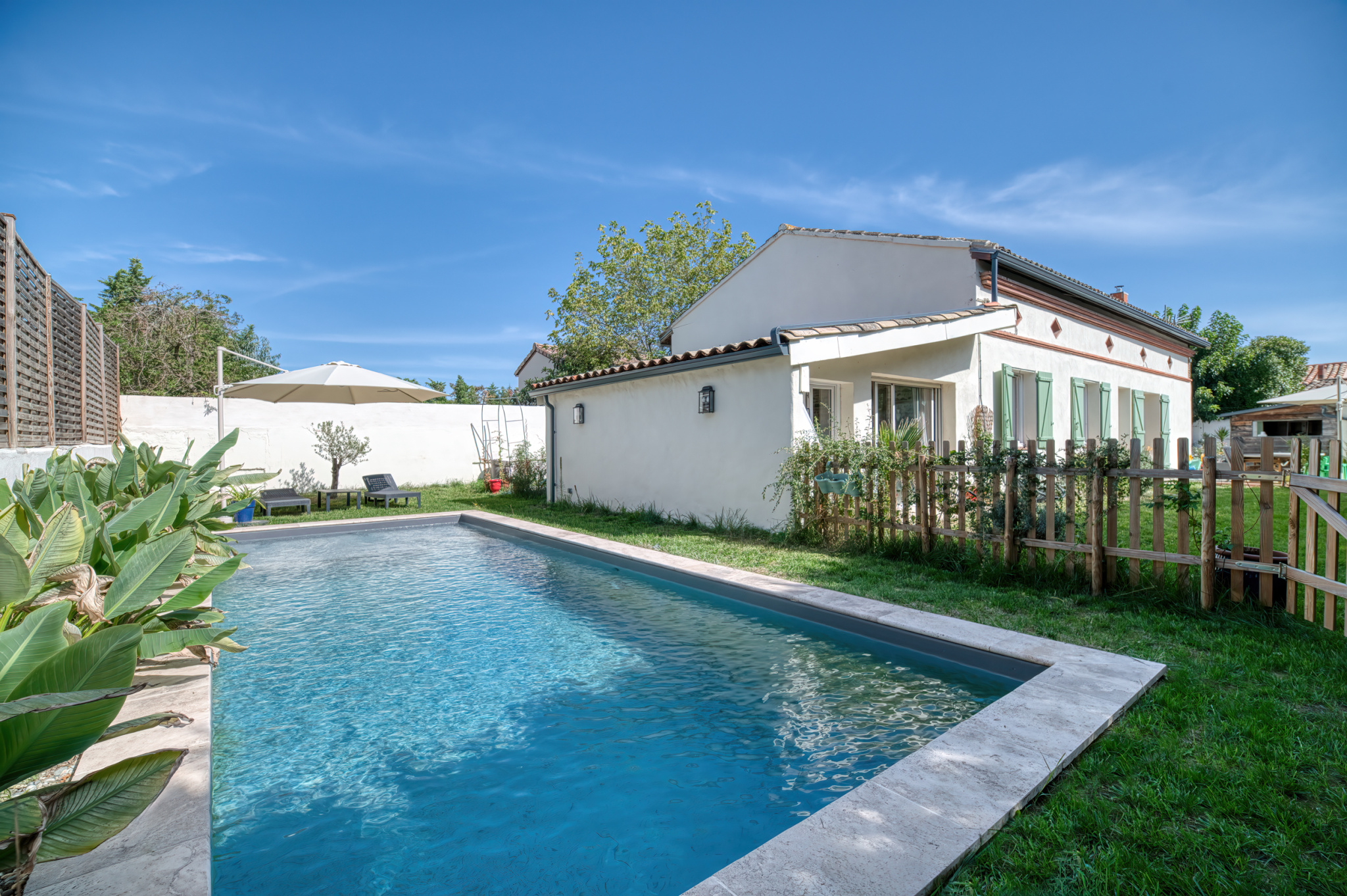 Belle piscine au sel, sécurisée avec espace détente sans vis à vie