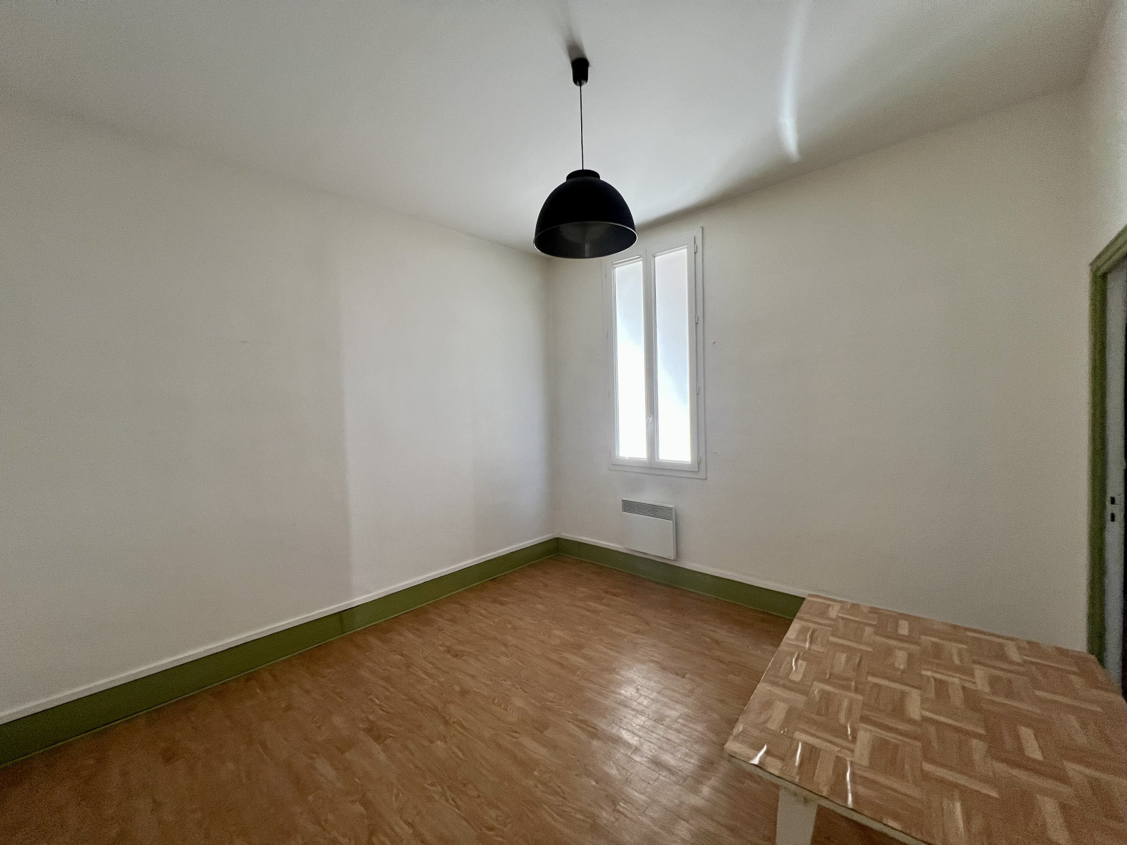 Grande pièce de vie, cuisine séparée, chambre et salle d'eau.