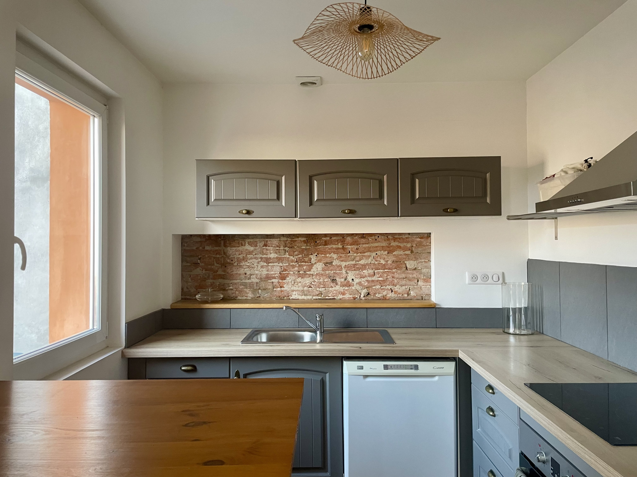Spacieuse pièce à vivre de 34 m2 avec cuisine ouverte, séparée par un bar. Buanderie attenante